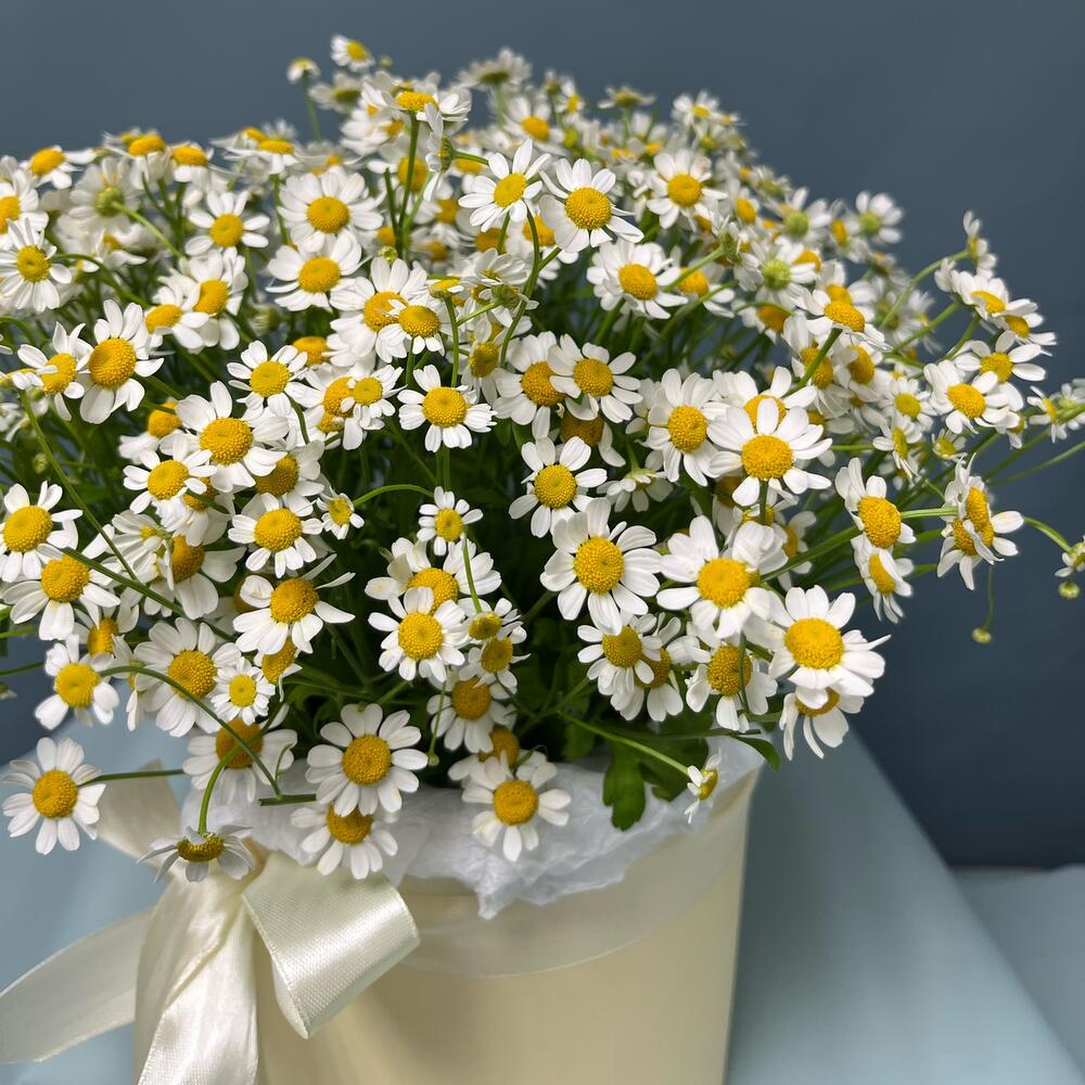 Матрикария – 11 шт.Тишью – 1 шт.Коробка шляпная – 1 шт.Лента атласная – 1 шт.Оазис флористический – 1 шт.