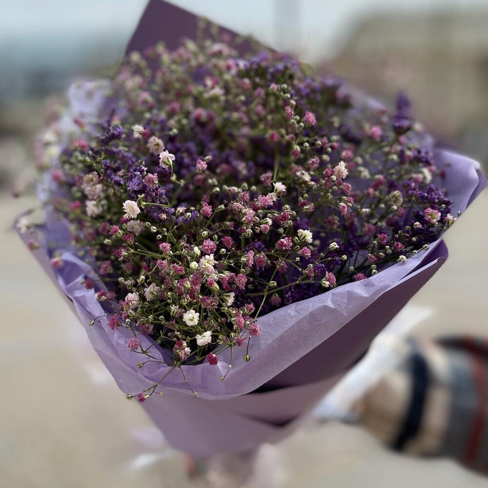Гипсофила – 3 шт.Упаковка дизайнерская – 2 шт.Лента – 1 шт.