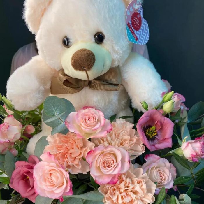 Шляпная коробка большая vip – 1 шт.Плюшевый медведь – 1 шт.Роза кустовая – 2 шт.Лизиантус – 1 шт.Альстромерия Микс Европа – 1 шт.Диантус – 3 шт.Гиперикум – 1 шт.Эвкалипт – 3 шт.