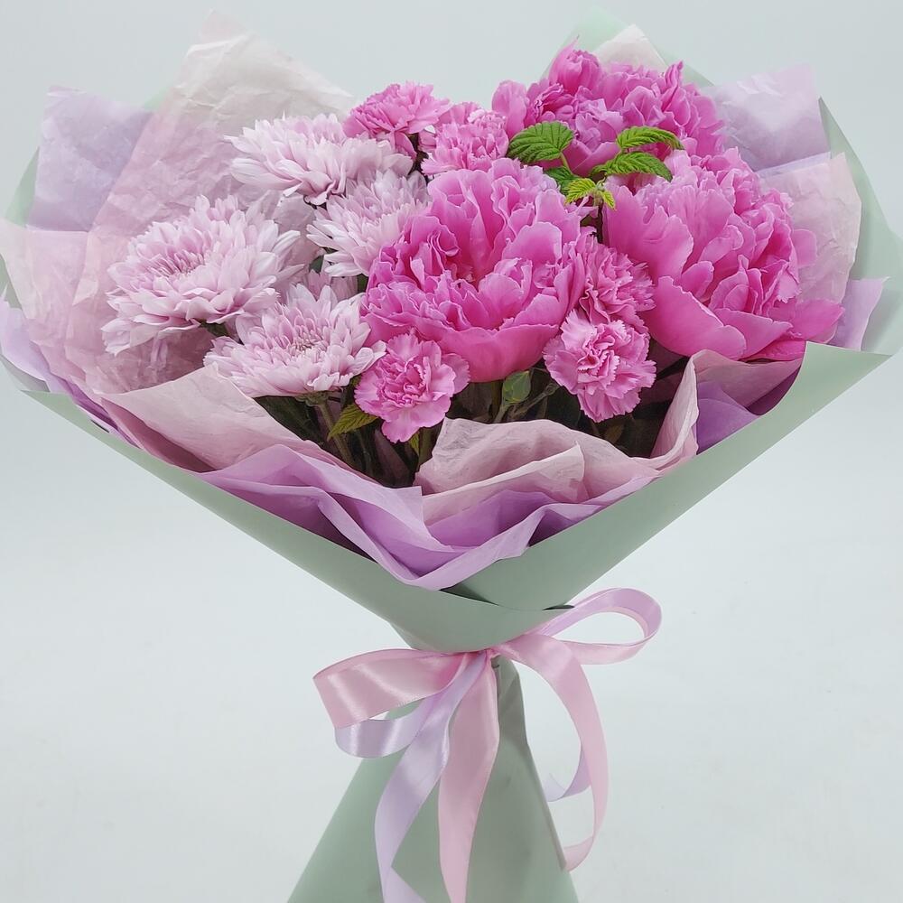 Пион – 3 шт.Хризантема кустовая – 1 шт.Гвоздика кустовая – 2 шт.Упаковка дизайнерская – 1 шт.рубус зелень – 1 шт.