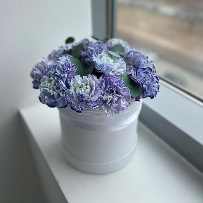 Шляпная коробка с лавандовой гвоздикой с эвкалиптом, небольшого размера, 20 см в диаметре и 25 см высотой
