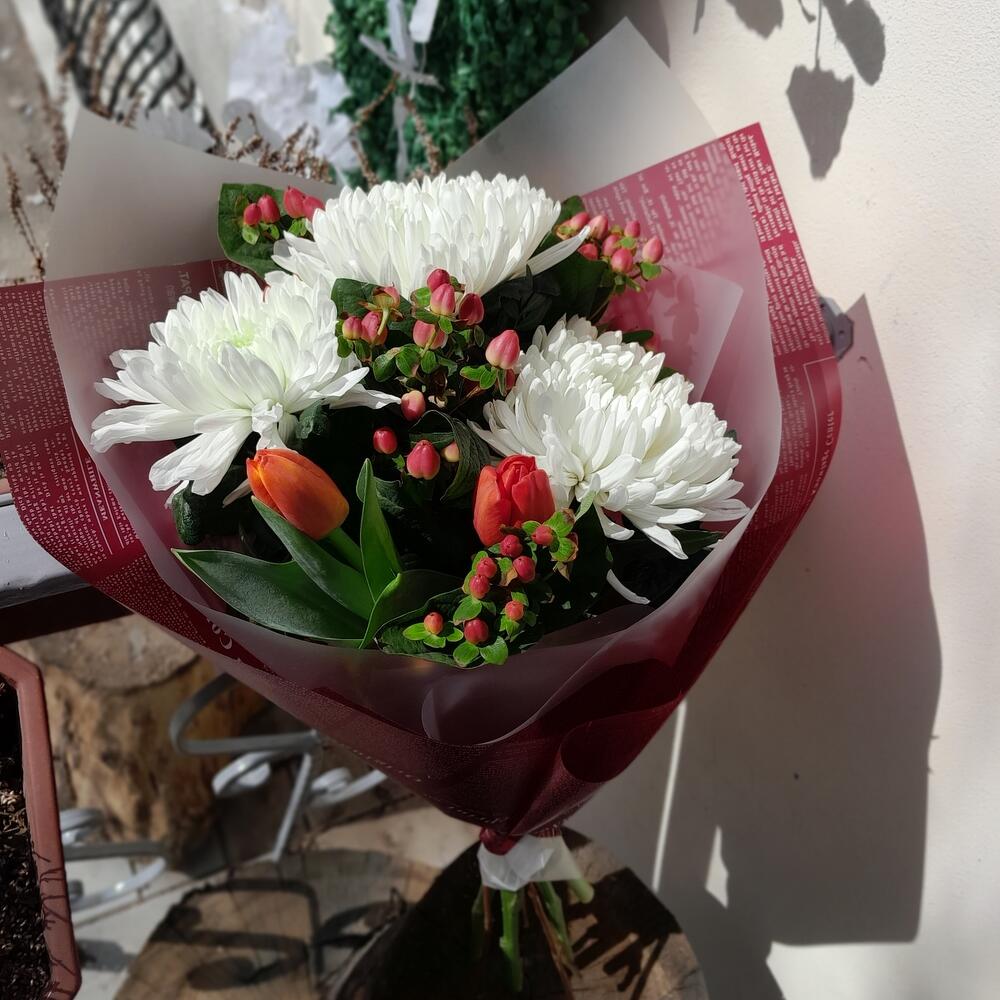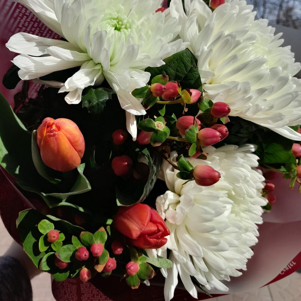 Букет из хризантем, тюльпанов и хиперикума