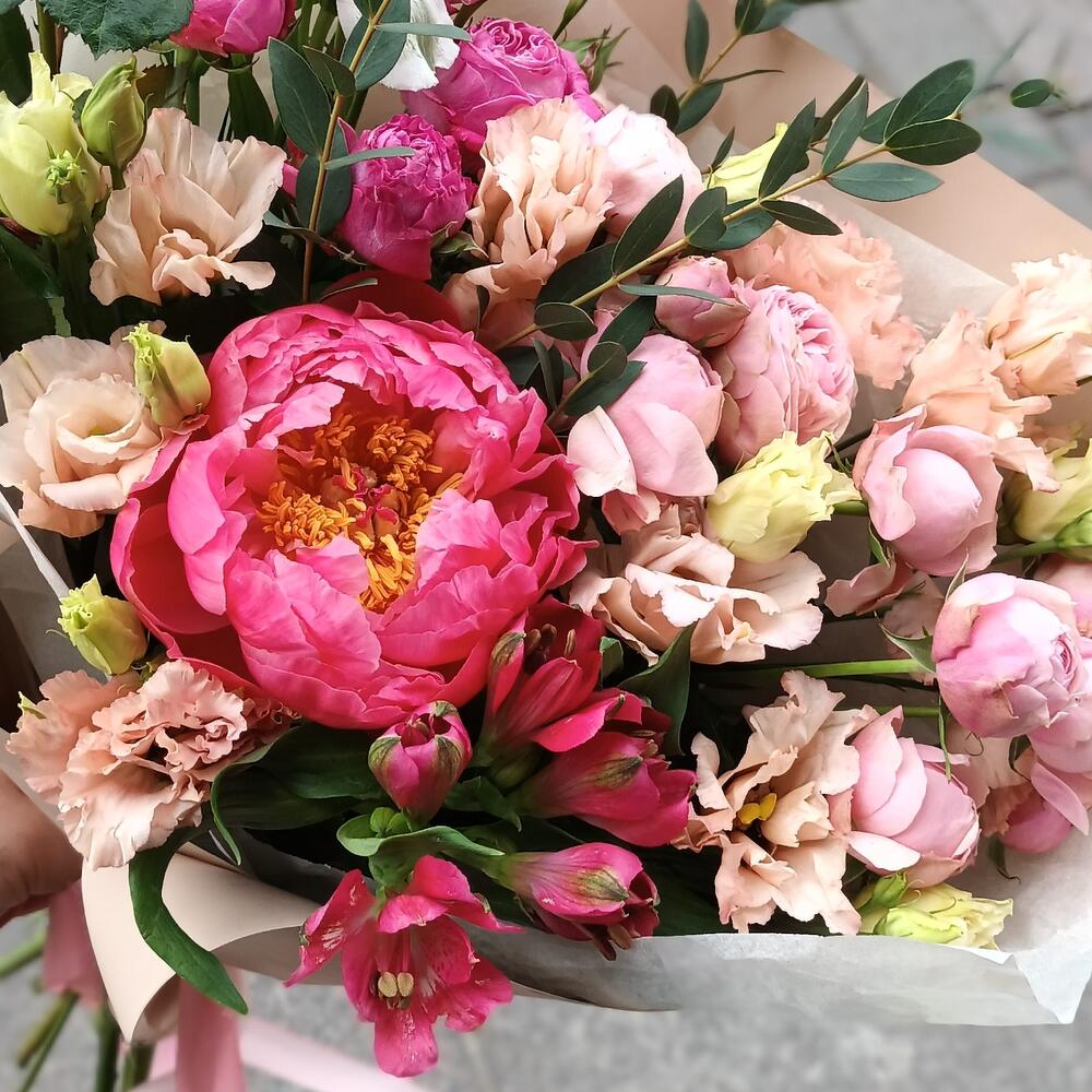 Альстромерия – 2 шт.Лизиантус – 1 шт.Пион – 1 шт.Эвкалипт – 1 шт.Лента атласная – 2 шт.Роза кустовая пионовидная – 3 шт.Крафт упаковка – 1 шт.Калька упаковка – 1 шт.иксия – 2 шт.