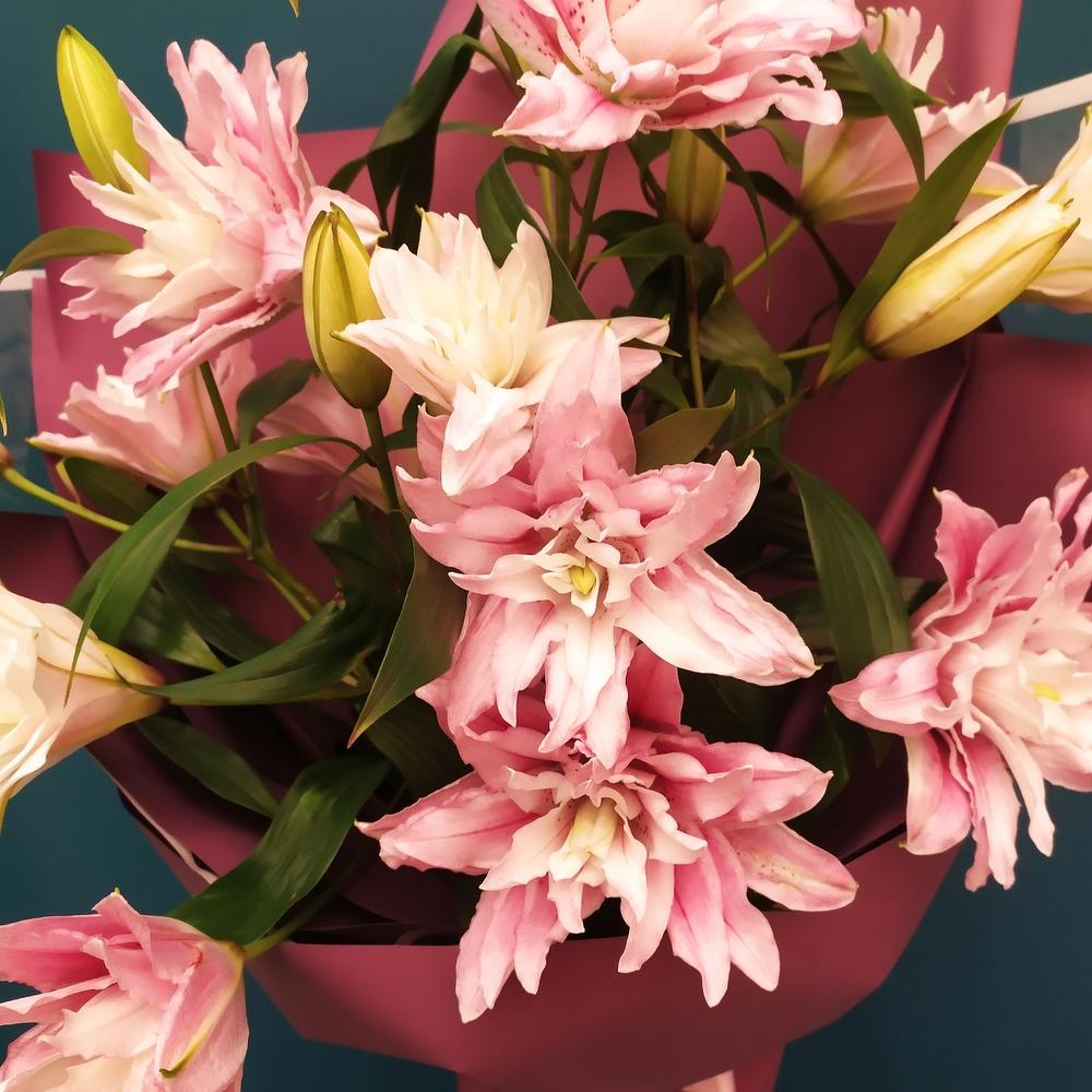 Лента атласная – 1 шт.Упаковка дизайнерская – 4 шт.лилия пионовидная махровая белая – 5 шт.