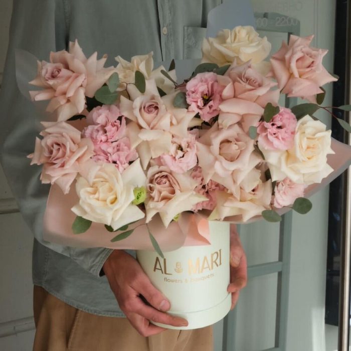 Букет из роз, лизиантуса, гвоздик и зелени в шляпной коробке «Хермоза»