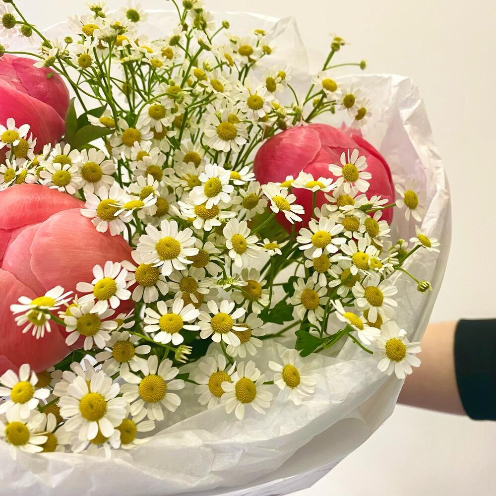 Пион коралл шарм – 3 шт.Матрикария – 5 шт.Упаковка дизайнерская – 1 шт.
