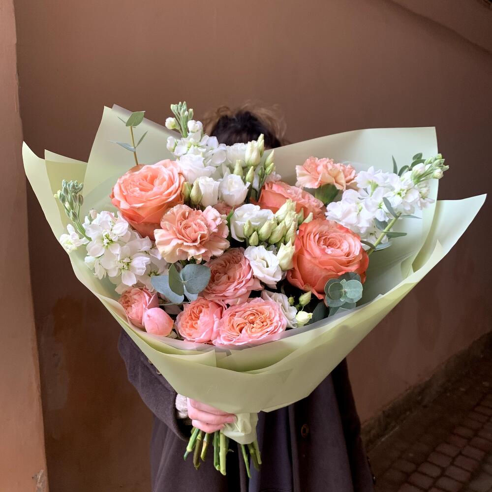 Маттиола – 3 шт.Эвкалипт – 1 шт.Лизиантус белый – 2 шт.Рускус сочи – 5 шт.Гвоздика карамель – 3 шт.Роза кахала – 3 шт.Роза кустовая пионовидная джульетта – 1 шт.Авторская упаковка – 1 шт.