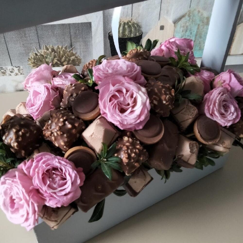 “Сладкое сердце ” – цветочная композиция с сладостями в коробке “Сердце”