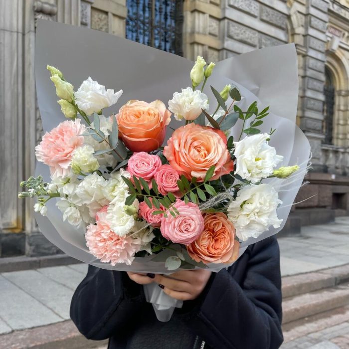 Лизиантус – 2 шт.Маттиола – 1 шт.Эвкалипт – 2 шт.Гвоздика – 2 шт.Фисташка – 3 шт.Роза пионовидная – 3 шт.Роза кустовая пионовидная – 1 шт.Упаковка дизайнерская – 3 шт.Ковыль – 1 шт.