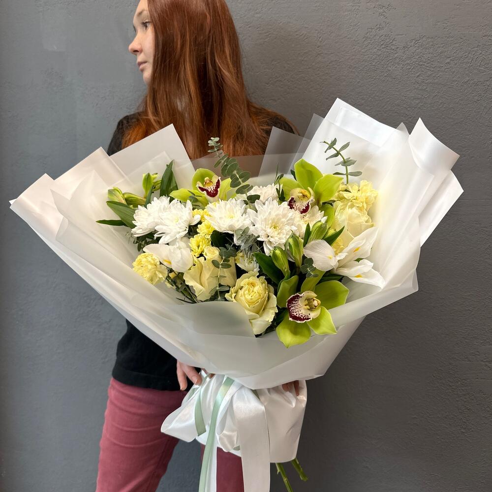 Альстромерия – 3 шт.Хризантема кустовая – 2 шт.Эвкалипт – 3 шт.Роза – 3 шт.Лента атласная – 2 шт.Фисташка – 1 шт.орхидея – 2 шт.Упаковка дизайнерская – 2 шт.Диантус кустовой – 2 шт.саньини – 1 шт.