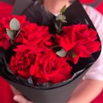 Эвкалипт – 1 шт.Лента атласная – 1 шт.Тишью – 1 шт.фоамиран черный – 1 шт.роза красная французская – 5 шт.