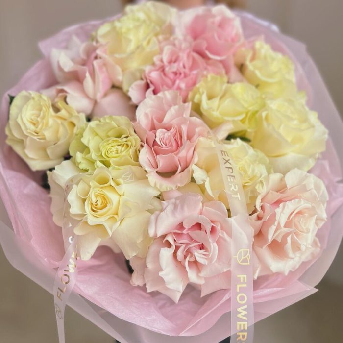 Букет из 15 французских роз “WHITE PINK MONDIAL