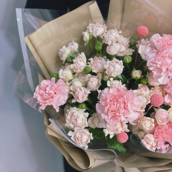 Краспедия – 4 шт.Кустовая роза – 8 шт.Гвоздика – 7 шт.Лента атласная – 2 шт.Упаковка дизайнерская – 5 шт.