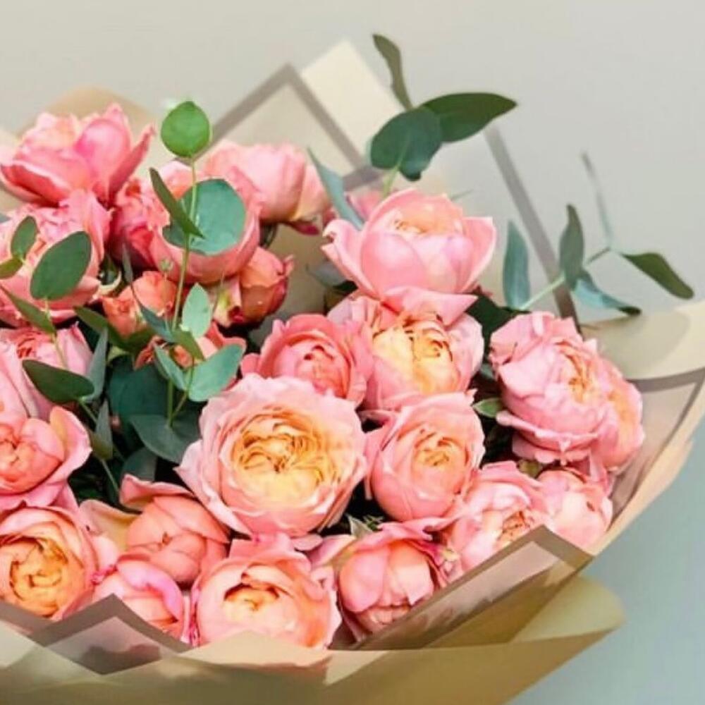 Букет из нежно розовых пионовидных роз с экалиптом