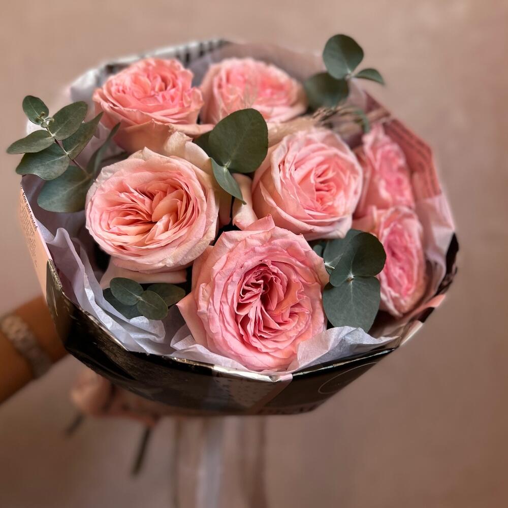 Эвкалипт – 5 шт.Сухоцветы – 1 шт.Пионовидная роза – 7 шт.Атласная лента – 1 шт.декоративная упаковка – 1 шт.