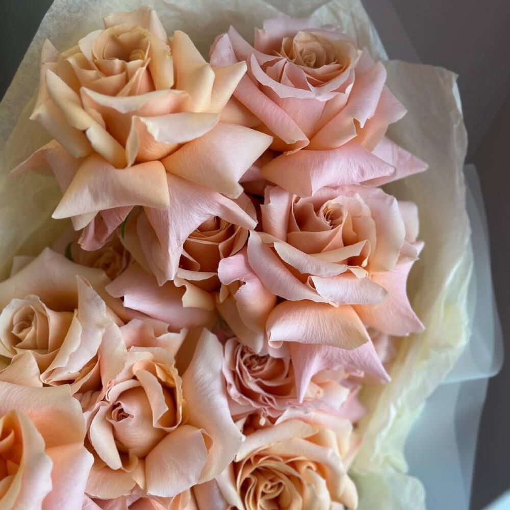 Букет из вывернутых персиково-розовых роз в нежной упаковке