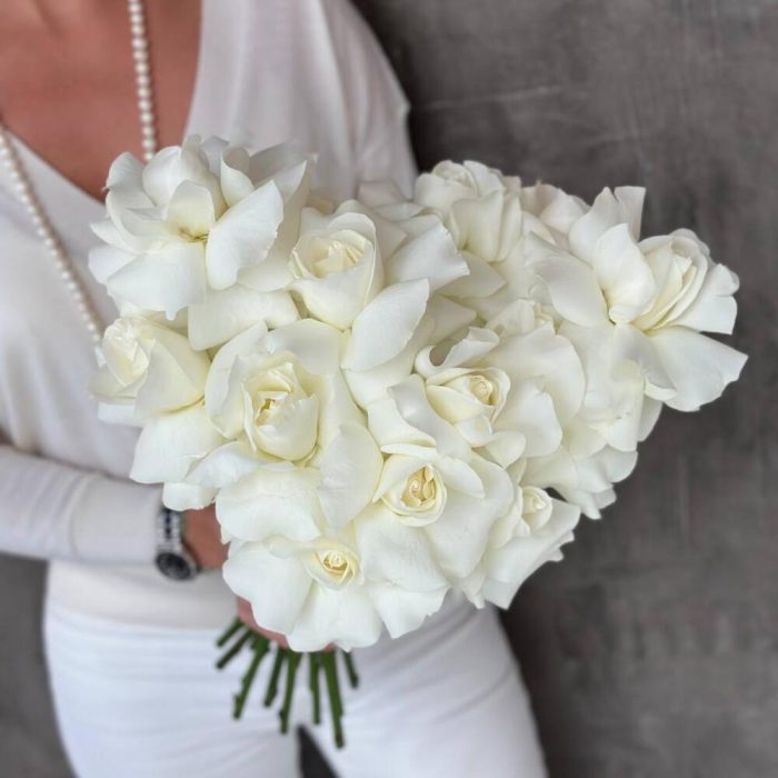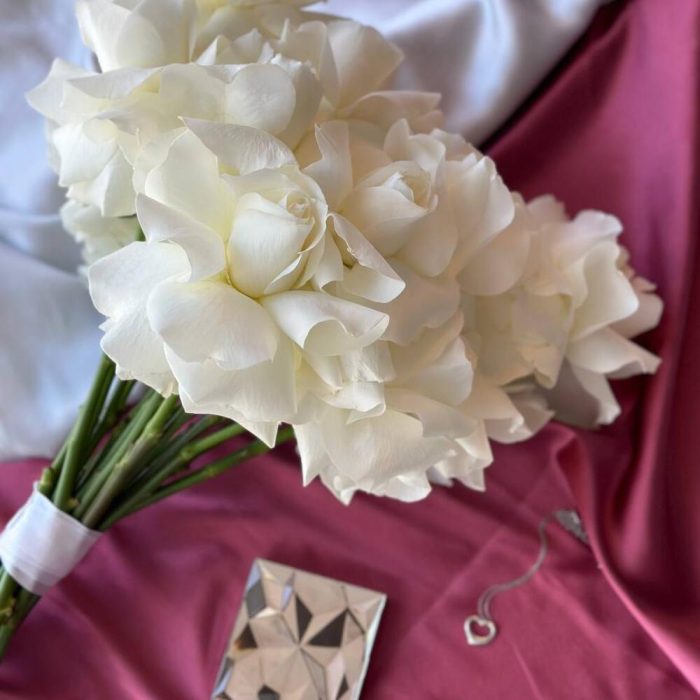 Подарочная упаковка – 1 шт.Лента атлас – 1 шт.Роза белая одноголовая – 19 шт.средство для продления жизни срезанных цветов – 1 шт.