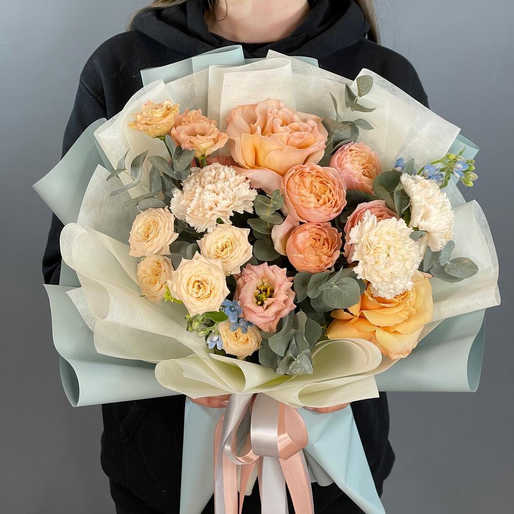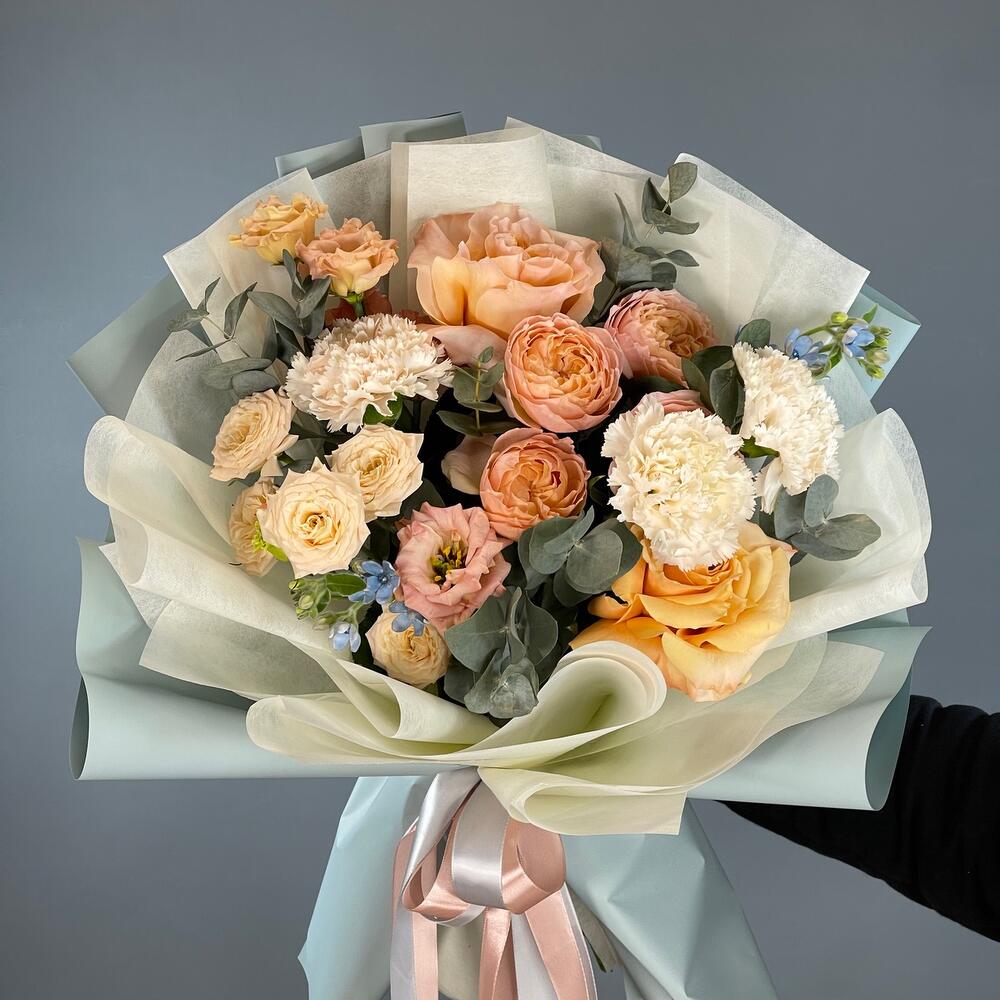 Лента – 2 шт.Лизиантус – 1 шт.Роза кустовая – 3 шт.Эвкалипт – 2 шт.Роза одноголовая – 2 шт.Упаковка – 1 шт.Гвоздика – 3 шт.Оксипеталум – 2 шт.