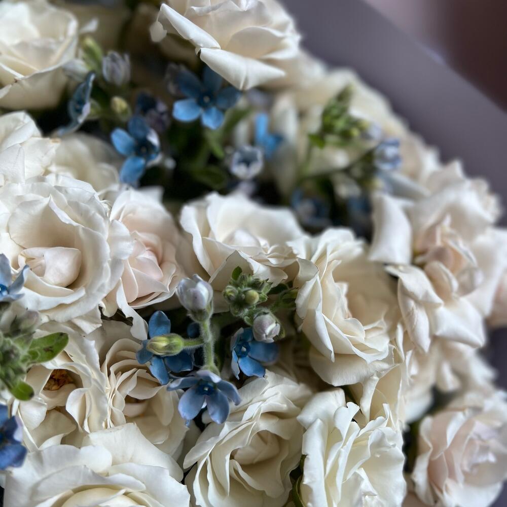 Кустовая белая роза – 13 шт.Оксипеталум – 5 шт.декоративная упаковка – 1 шт.Атласная лента – 1 шт.