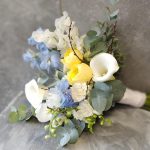 Дельфиниум – 2 шт.Калла – 3 шт.Латирус – 3 шт.Роза кустовая – 3 шт.Эвкалипт – 3 шт.Диантус – 5 шт.Роза садовая – 2 шт.лента декоративная – 1 шт.ветки декоративные – 3 шт.бутоньерка для жениха – 1 шт.
