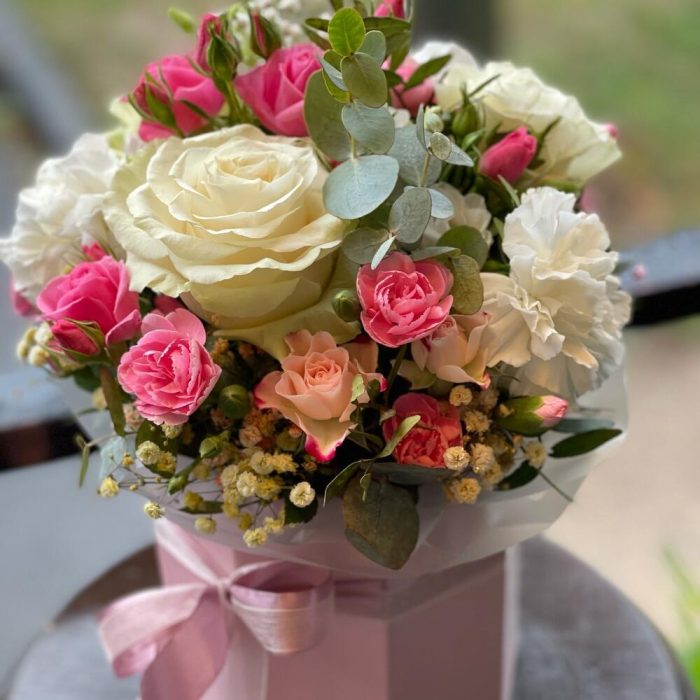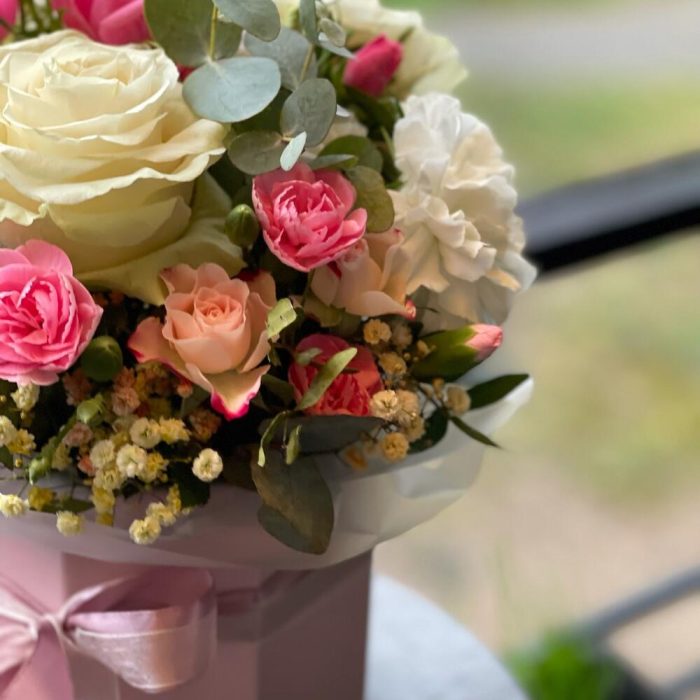 “Атлас☁️” – цветочная композиция с зефиром в деревянном ящике