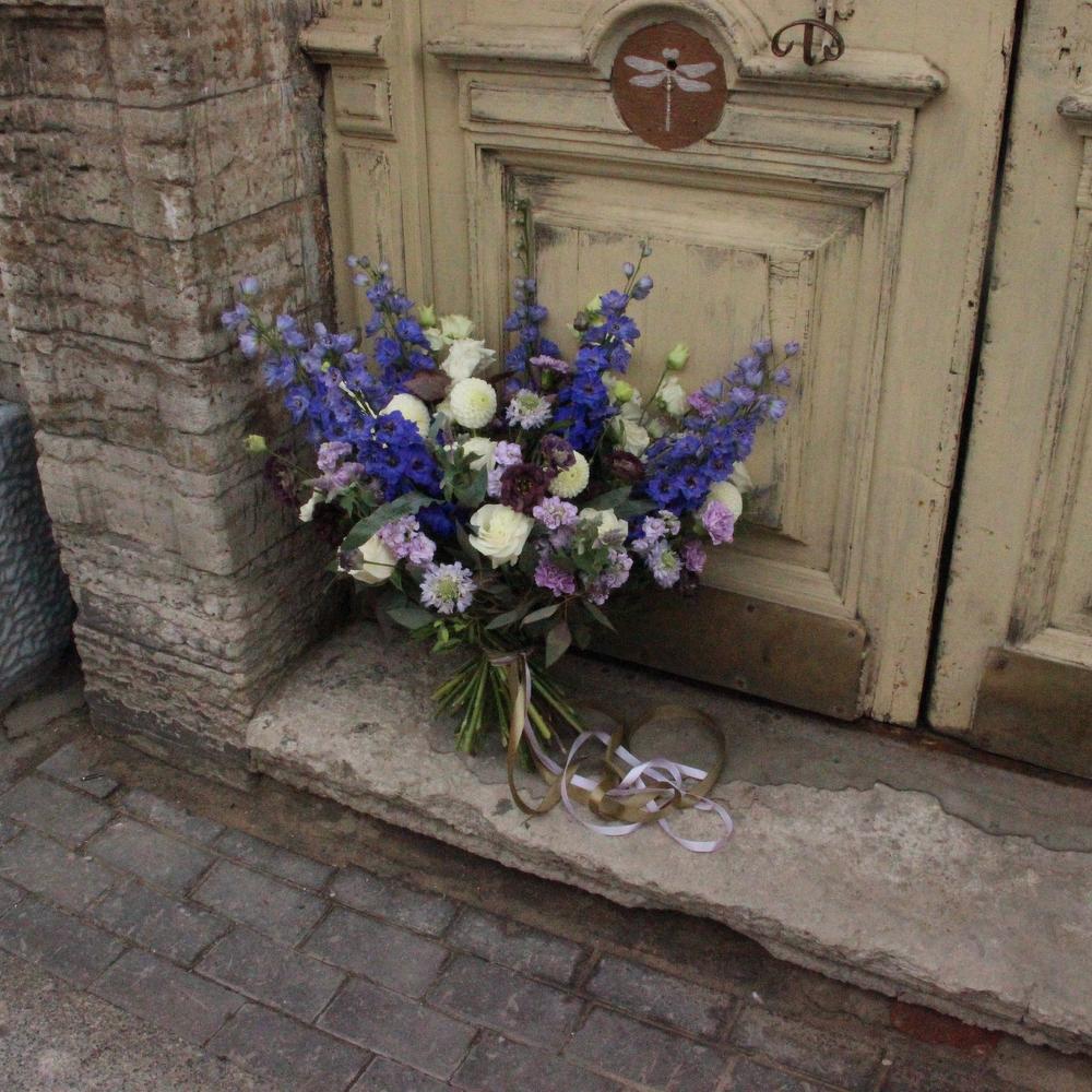 Дельфиниум – 9 шт.Георгина – 5 шт.Роза сортовая – 5 шт.Маттиола – 5 шт.Лизиантус – 7 шт.Диантус – 5 шт.Эвкалипт – 9 шт.Скабиоза – 7 шт.Роза кустовая – 5 шт.Лента атласная – 2 шт.