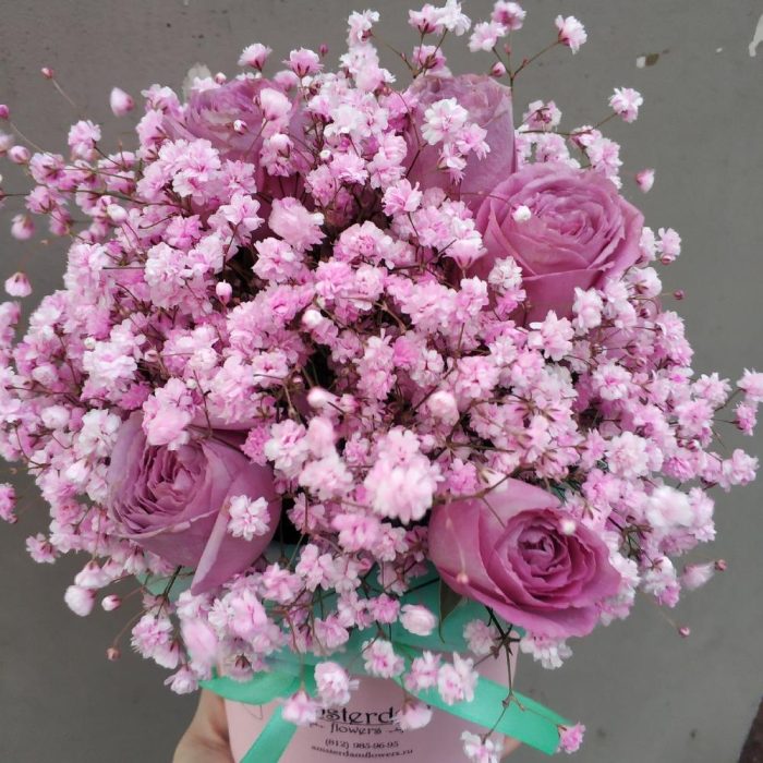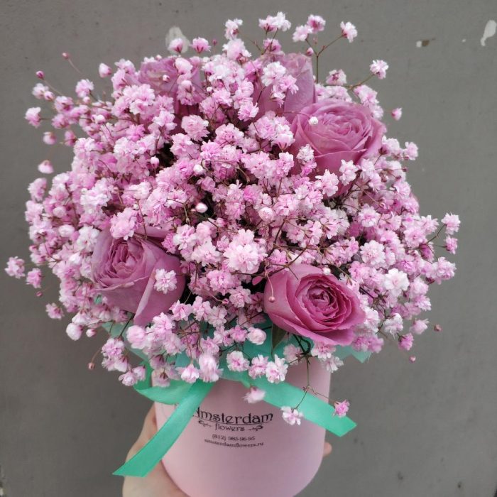 Роза кустовая пионовидная – 5 шт.Гипсофила розовая – 3 шт.Коробка d12 – 1 шт.Оазис – 1 шт.Упаковка – 1 шт.Лента – 1 шт.
