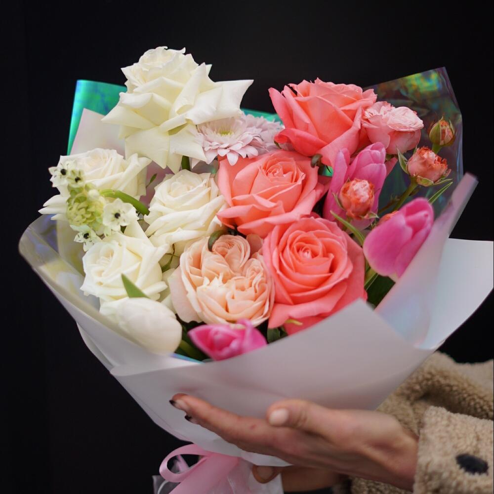 Роза цветная – 7 шт. Роза пионовидная – 1 шт. Кустовая роза – 2 шт. Тюльпан – 3 шт. Хризантема – 3 шт. Орнитогалум – 1 шт. Упаковка дизайнерская – 2 шт. Открыточка с вашими пожеланиями – 1 шт. инструкция по уходу за цветами – 1 шт.