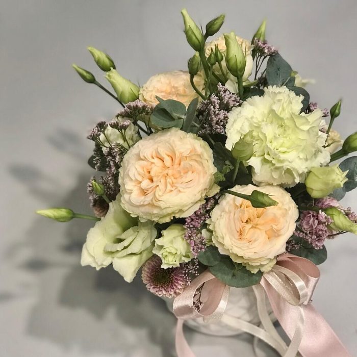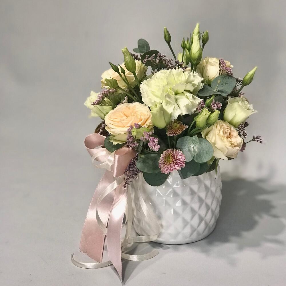 Кашпо керамическое – 1 шт.Оазис флористический – 1 шт.Роза кустовая пионовидная – 1 шт.Сантини – 1 шт.Лимониум – 1 шт.Гвоздика – 1 шт.Лизиантус – 1 шт.Эвкалипт – 1 шт.Лента – 1 шт.