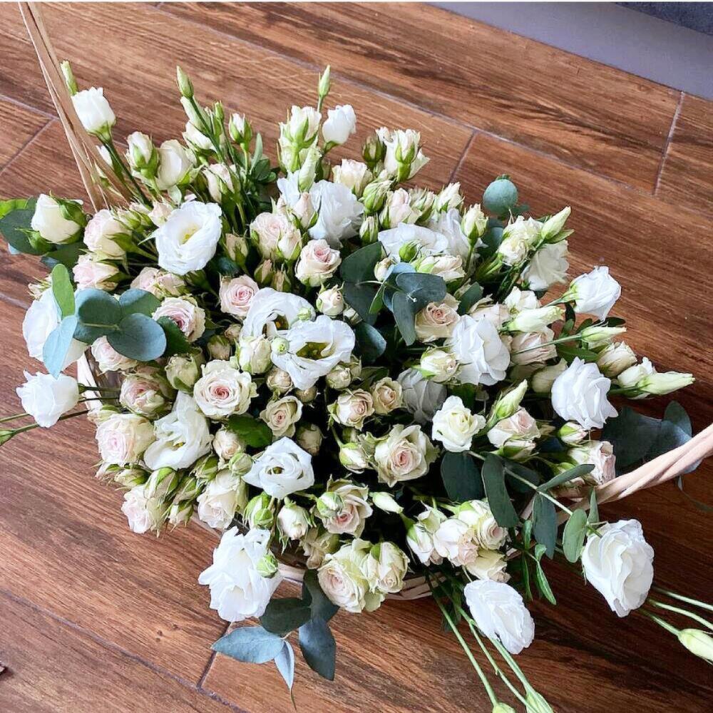 Лизиантус – 10 шт.Роза кустовая – 15 шт.Зелень – 5 шт.Оазис флористический – 1 шт.