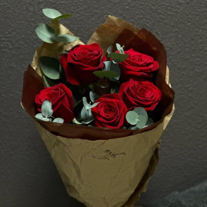 Лента – 1 шт.Эвкалипт – 1 шт.Тишью – 1 шт.Крафт – 1 шт.Красная роза – 5 шт.