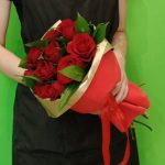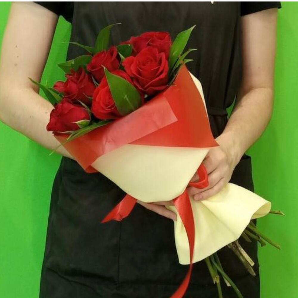 роза кения 50 см – 11 шт.Рускус – 7 шт.фоамиран лист – 1 шт.Лента атласная – 2 шт.