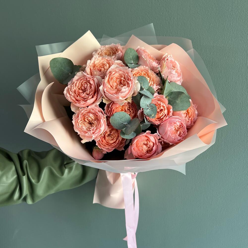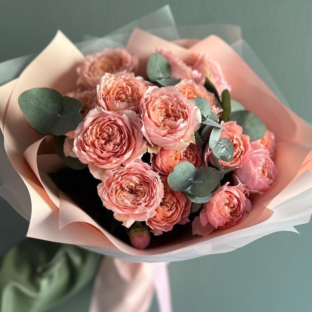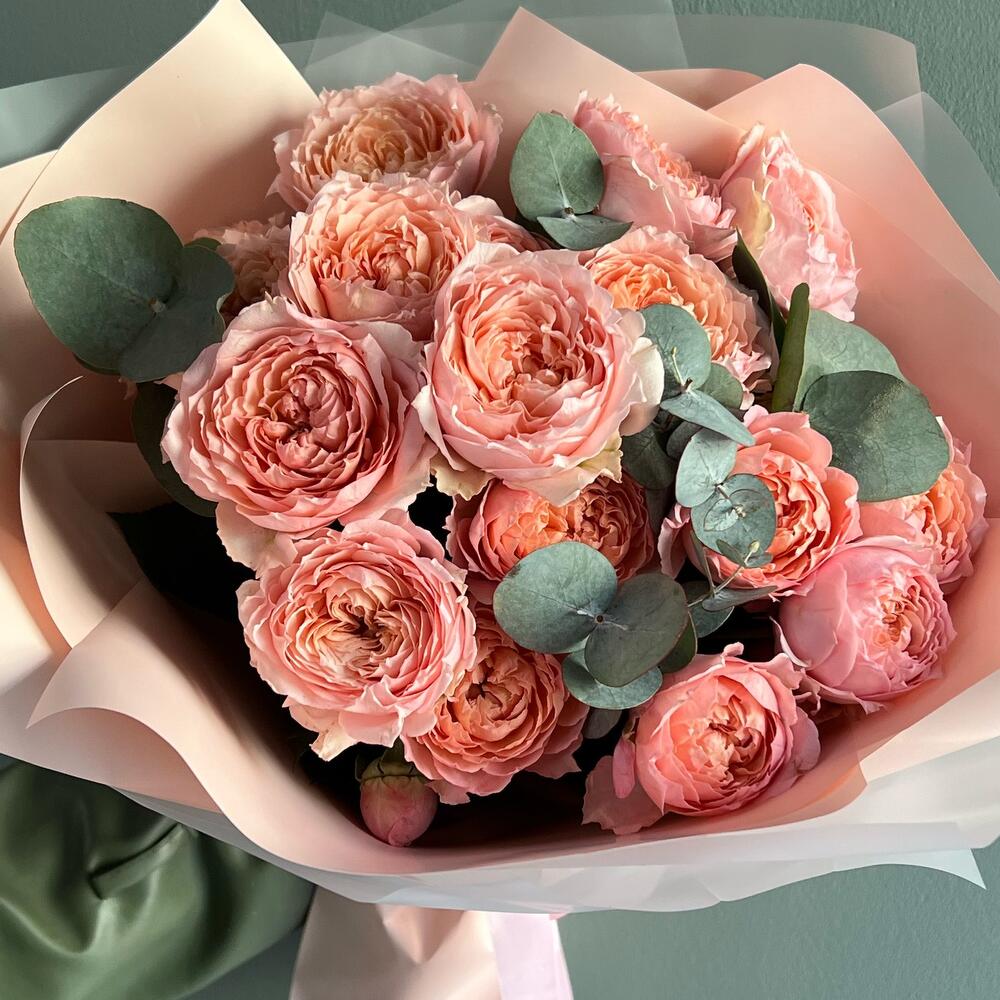 Эвкалипт – 3 шт.Упаковка дизайнерская – 2 шт.джульетта роза пионовидная – 5 шт.