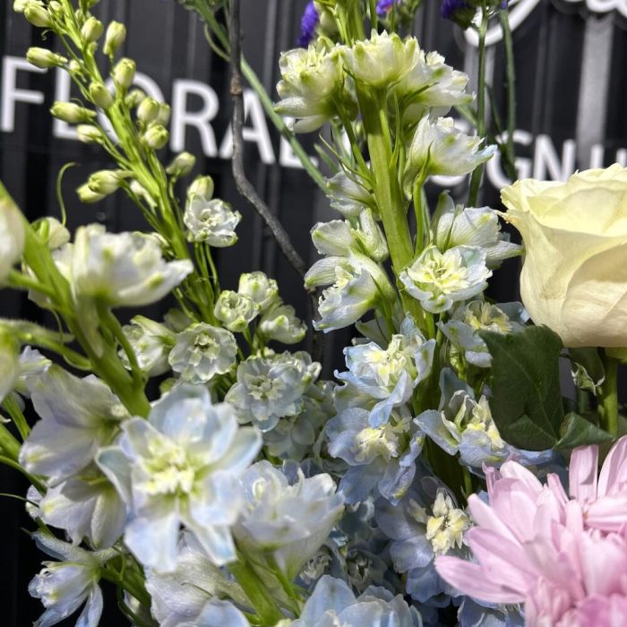 Дельфиниум – 5 шт. Статица – 3 шт. Роза мондиаль 60 см – 6 шт. Хризантема кустовая – 6 шт.