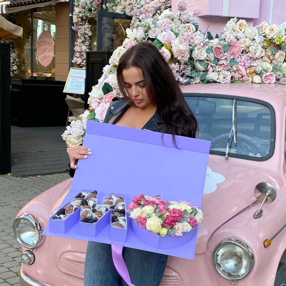 Эвкалипт – 5 шт.Роза Эквадор – 3 шт.Эустома – 5 шт.Коробка – 1 шт.Голубика – 20 шт.Клубника в шоколаде – 15 шт.