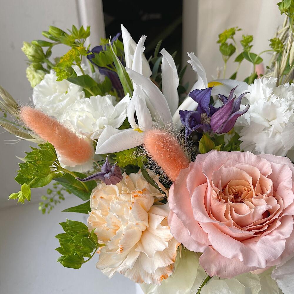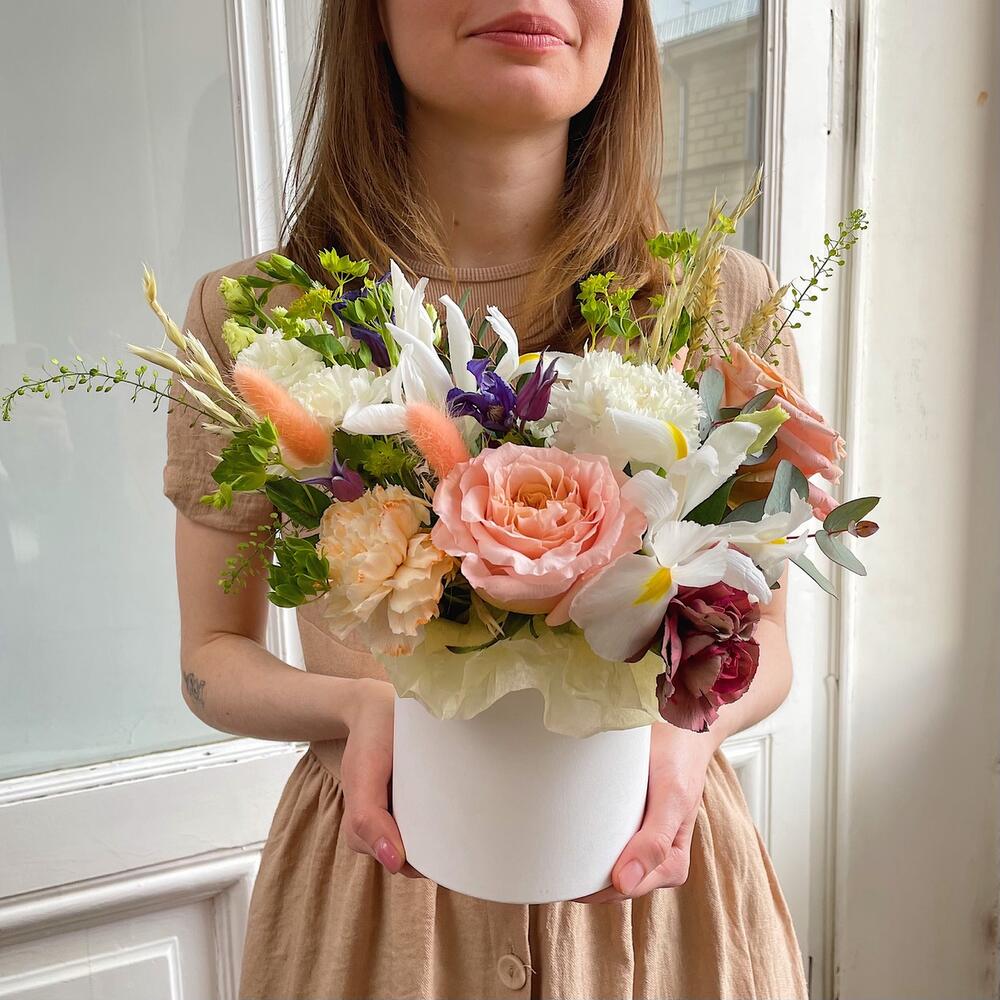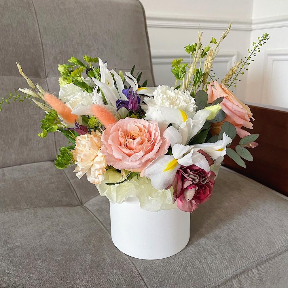 Роза персиковая – 2 шт.Диантус – 4 шт.Клематис – 1 шт.Ирис – 2 шт.Буплерум – 1 шт.Лагурус – 2 шт.овес сухоцвет – 2 шт.Эвкалипт – 1 шт.Коробка шляпная – 1 шт.Губка флористическая – 1 шт.