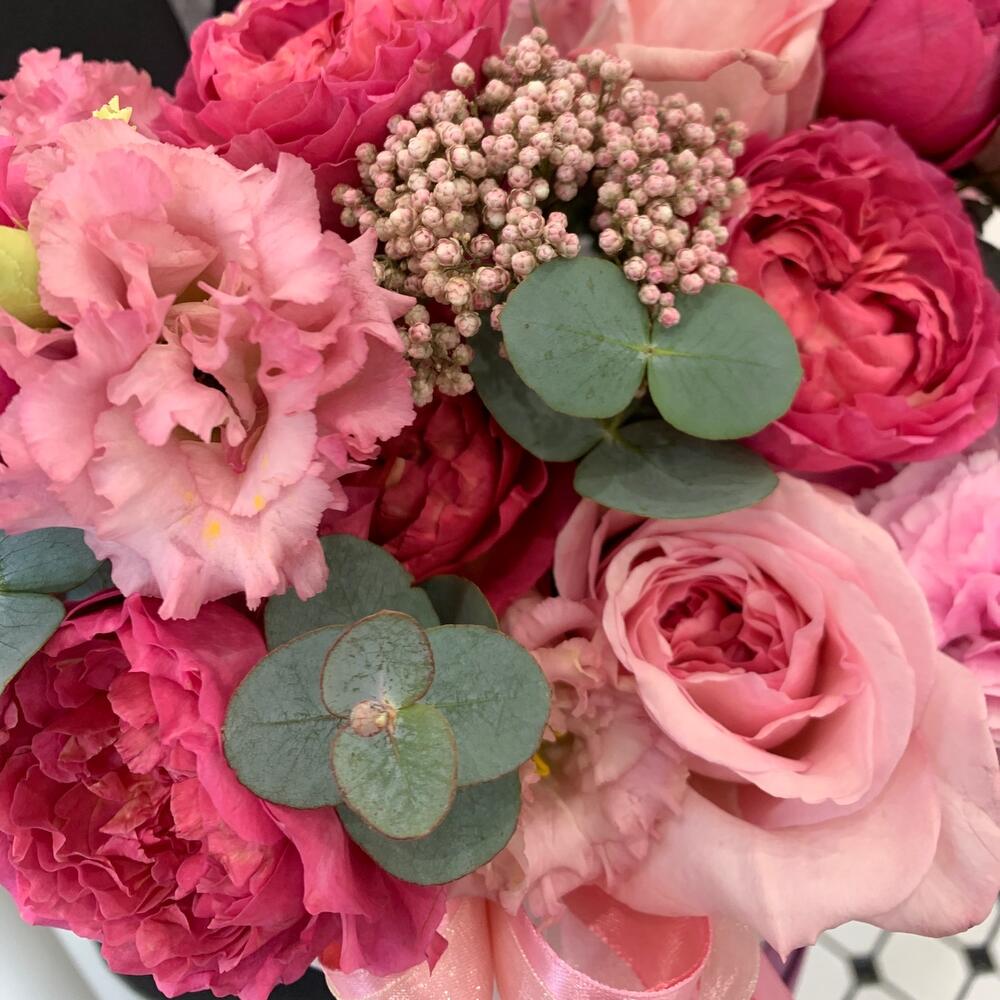 Оазис флористический – 1 шт.Тишью – 1 шт.Лента атласная – 2 шт.Озотамнус – 1 шт.церайз – 2 шт.pink o’hara роза – 2 шт.Лизиантус – 2 шт.