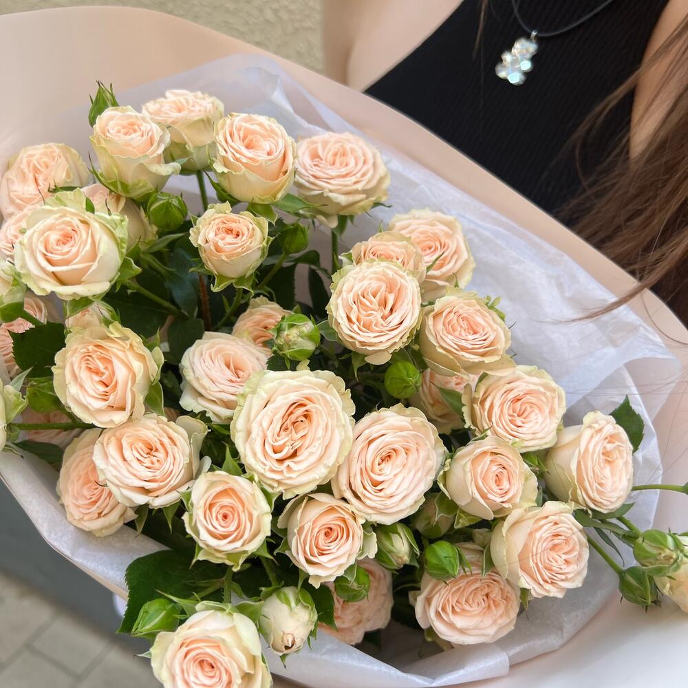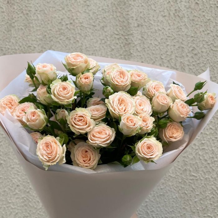 Лента атласная – 2 шт.Упаковка дизайнерская – 2 шт.Упаковка тишью – 1 шт.подкормка для срезанных цветов – 1 шт.кустовые пионовидные розы – 5 шт.