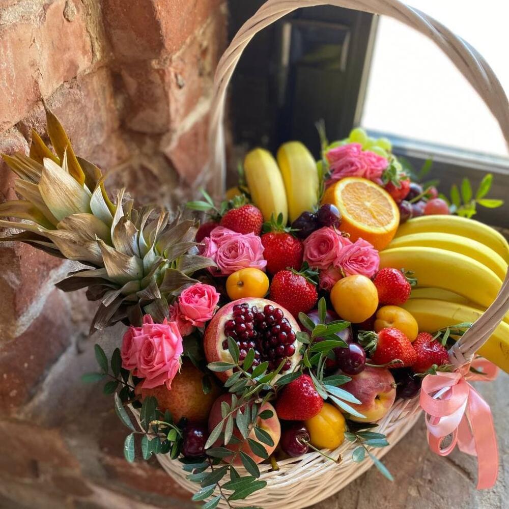 Клубника – 500 гр.Роза кустовая – 4 шт.Эвкалипт – 2 шт.Ананас – 1 шт.Виноград – 600 гр.Банан – 2500 гр.Гранат – 2 шт.Оазис – 2 шт.Яблоко – 3 шт.Апельсин – 2 шт.Груша – 3 шт.Персик – 5 шт.Слива – 5 шт.Корзина плетеная – 1 шт.Абрикос – 7 шт.черешня или ежевика – 200 гр.