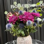 левкадендрон – 3 шт. Эвкалипт – 3 шт. Эрингиум – 3 шт. Хризантема одноголовая – 9 шт. Роза пинк флойл – 9 шт. спрей роза пионовидная – 3 шт.