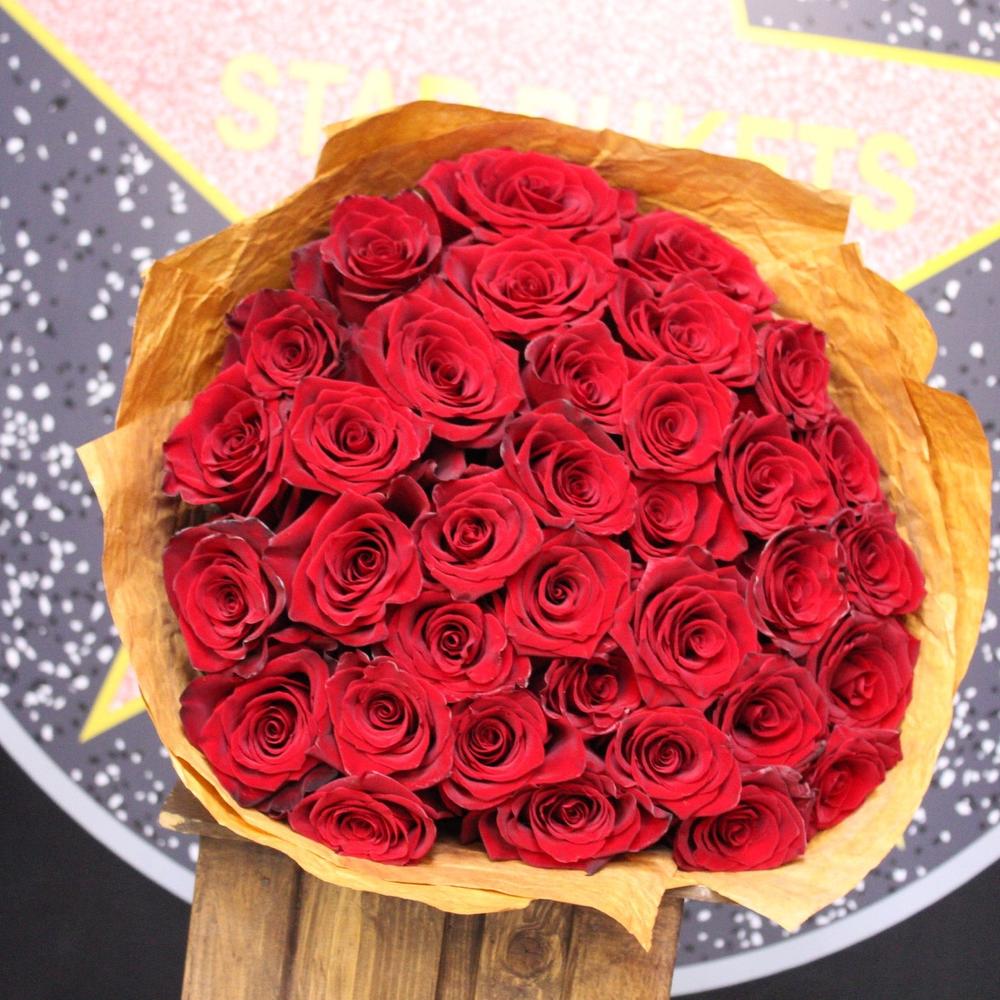 Роза Эксплорер – 35 шт.Крафт дизайнерский – 2 шт.Лента атласная – 2 шт.