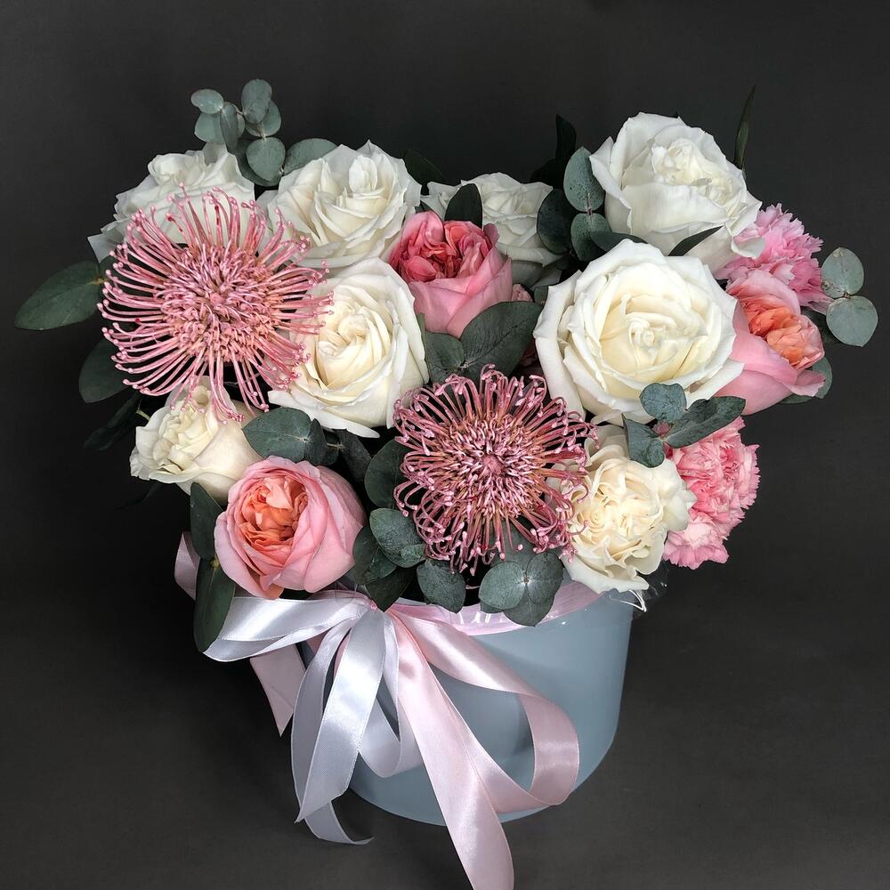 Огромная коробка с пионовидными розами и тропическими леукоспермумами. Когда хочется подарить не банальные розы