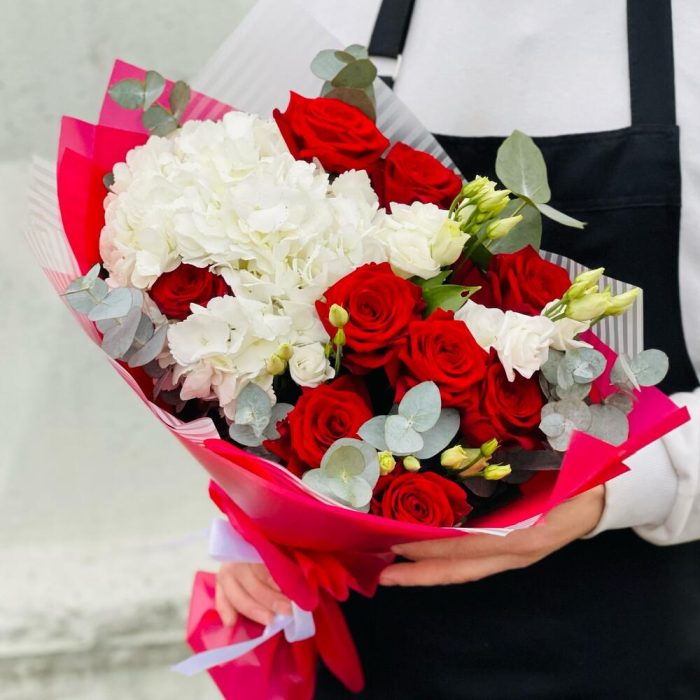 Гортензия – 1 шт.Роза красная – 9 шт.Рускус – 10 шт.Эвкалипт – 3 шт.Эустома – 5 шт.Лента атласная – 1 шт.Упаковка дизайнерская – 5 шт.
