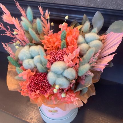гипсофила радужная – 5 шт.Роза кустовая сухоцвет – 2 шт.амми сушеный – 2 шт.Лагурус (сухоцвет) – 5 шт.эрингиум сухоцвет – 2 шт.аллиум сушеный – 1 шт.стакан кофейный – 1 шт.Губка флористическая – 1 шт.Лента атласная – 2 шт.