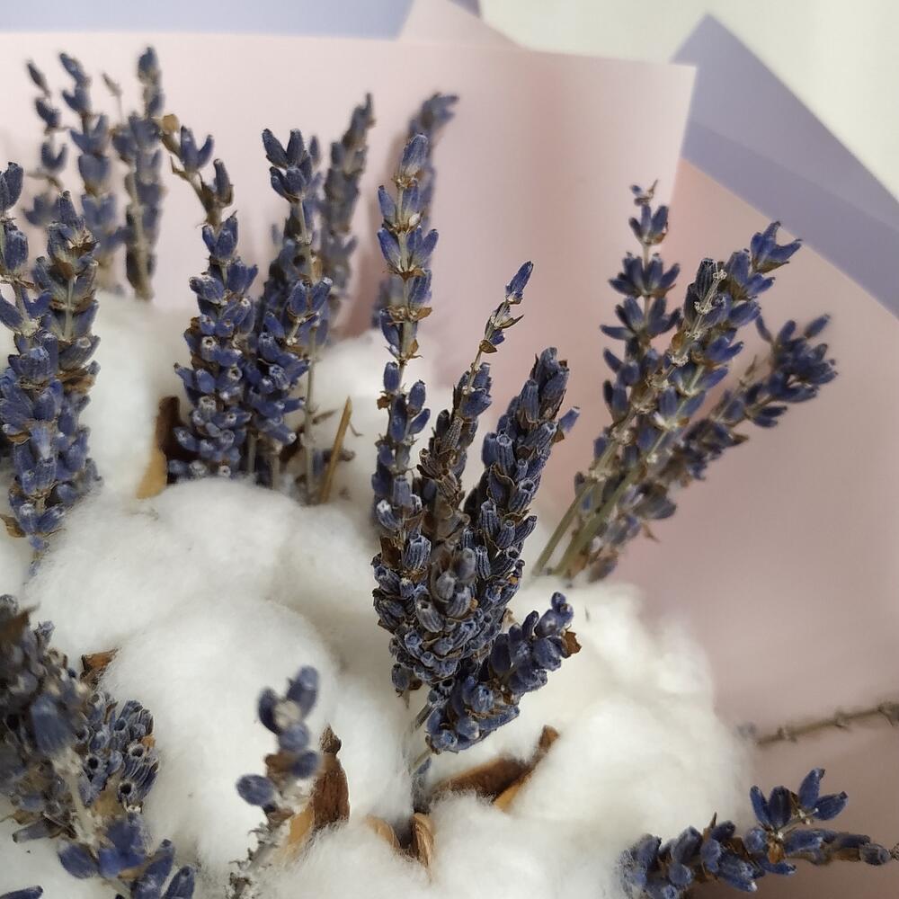 Невесомый букет из натурального хлопка и ароматной лаванды станет нежным украшением на долгое время.