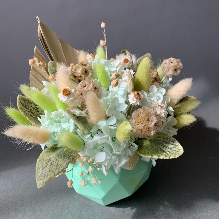 Кашпо – 1 шт.Оазис флористический – 1 шт.пика пальма – 1 шт.гортензия стабилизированная – 6 шт.роданте сухоцвет – 11 шт.стахис стабилизированный – 10 шт.Лагурус – 23 шт.Скабиоза сухая – 5 шт.