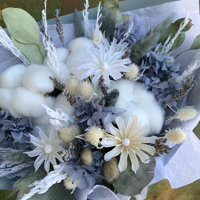 Хлопок – 4 шт.цветы – 5 шт.гортензия серая – 5 шт.Лагурус – 12 шт.Лаванда – 17 шт.лимониум стабилизированный – 2 шт.эвкалипт натуральный сухой – 5 шт.Эрингиум белый – 1 шт.Тишью белое – 1 шт.Пленка матовая – 1 шт.ленты атласные – 2 шт.