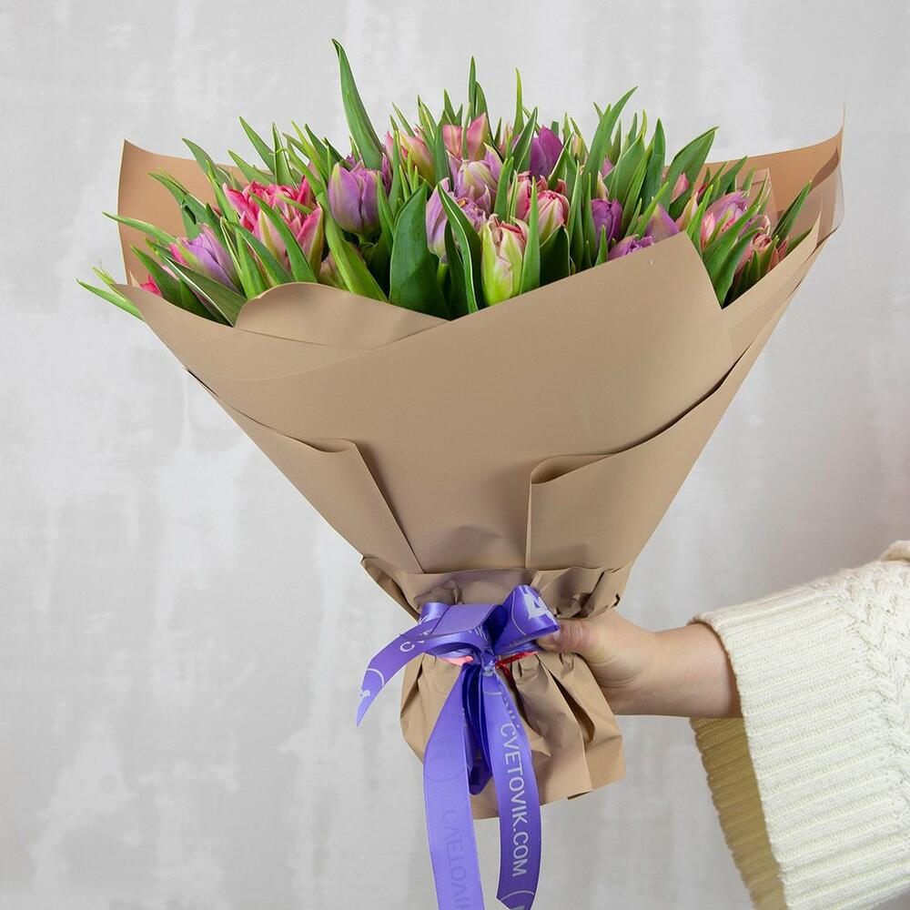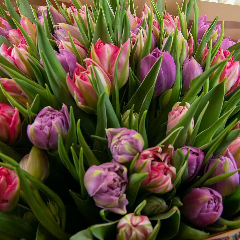 Букет из 51 тюльпана пионовидного микс в стильной упаковке